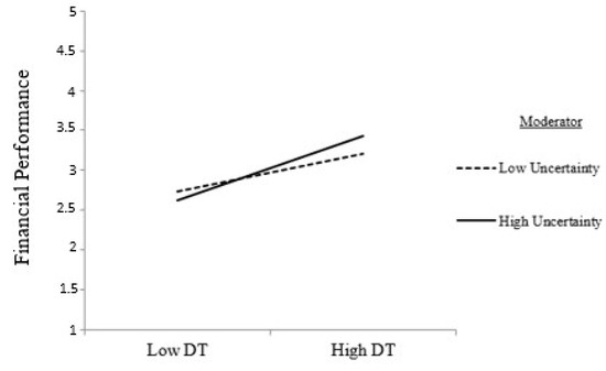 Hierarchical moderated regression analysis was performed to test H5 and H6. For this purpose, independent and moderator variables, which are digital transformation and environmental uncertainty, were standardized, and the interaction term (DT*EU) was constituted by multiplying them. The results are shown in Table 4. According to findings, environmental uncertainty moderates the relationship between digital transformation and financial performance, supporting H6. Moreover, f2 was calculated, and it was found that the moderation effect is a small effect size (f2 ≥ 0.02) based on Cohen [98]. However, it does not moderate the relationship between digital transformation and operational performance. Therefore, H5 was not supported. The moderating impact of environmental uncertainty is plotted in Figure 2.