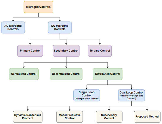 Power electronic converters are commonly used as interfaces in every microgrid. They enable the connection of each distributed energy resource to the shared DC bus [19]. The advent of direct current microgrid technology led to the widespread adoption of DC loads across diverse sectors, including fields like data centres and telecommunication facilities [20]. Many modern electronic devices like televisions, laptop or phone chargers, and LED bulbs require precise DC voltage levels for their operation. Hence, due to these characteristics, direct current MGs can potentially cater to the increasing needs of remote and small communities around the globe [21]. Highlighting the importance of regulating bus voltage and ensuring efficient current distribution within multi-source DC microgrids underscores a critical priority for ongoing research in this field. The traditional droop control method for direct current MGs has been employed in the literature due to its straightforward implementation, stemming from the absence of a communication network requirement [22]. However, this control technique encounters issues such as circulating current regulations, voltage fluctuations, and unbalanced current sharing due to line and droop resistance among the MG converters [9]. Voltage stability and current allocation accuracy are intricately linked to the droop resistance: increasing the droop resistance leads to greater voltage deviations but improves current sharing accuracy and vice versa [23]. Consequently, the traditional droop technique presents several limitations: it faces an inherent load-sharing and voltage control management trade-off, exhibits slow transient response, delivers suboptimal performance with distributed energy resources (DERs), and experiences impedance misalignment among parallel converters, affecting active power distribution. As a result, incorporating a secondary control loop alongside droop control can serve as an additional control layer for DC microgrids [14,18,24]. There are three primary categories of secondary control: decentralized, centralized, and distributed control. In centralized control, the microgrid relies on a single central controller that communicates with all distributed energy resources within the system. This controller must be able to handle all data from components operating within the microgrid [23]. This control method places a significant communication burden, leading to limited control reliability and heavy dependence on the central controller. If there is a communication breakdown or failure of the central controller, the entire system could become inoperative [23,25]. The decentralized control approach alleviates the limitations of centralized control by eliminating the necessity for communication among the DERs. Instead, only local measurements are utilized to implement the control loop for each operating distributed energy source within the microgrid. Deploying a secondary decentralized control system can pose challenges, potentially compromising the overall operational efficiency of the DC microgrid. This stems from the absence of a communication link, limiting access to global information. Consequently, the controller’s output might not adequately counterbalance the required deviation induced by the droop controls [16,23].