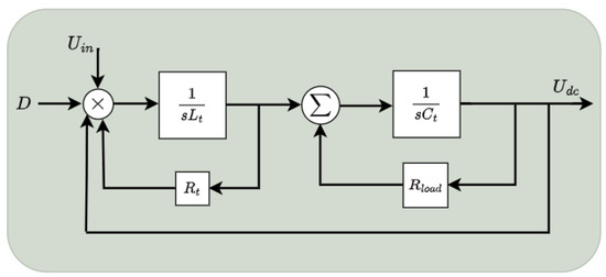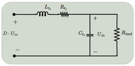 where , , and represent the parasitic inductance resistance, converter inductance, and capacitance, respectively. , D, and depict the load resistance, converter duty cycle, and inductor filter current, respectively.
