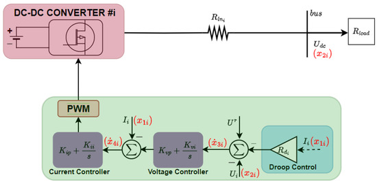 Analyzing the stability of the primary control for the converter involves deriving the state-space (SS) model using the schematics depicted in Figure 4, with the state variables highlighted in red. , , , and denote the inductor current, output capacitor voltage, voltage control integrator output, and current control integrator output of the ith converter, respectively. The dynamic expression representing the reference input of the voltage control integrator, contingent on the operation of the droop controller for the ith DER converter, can be formulated as:
