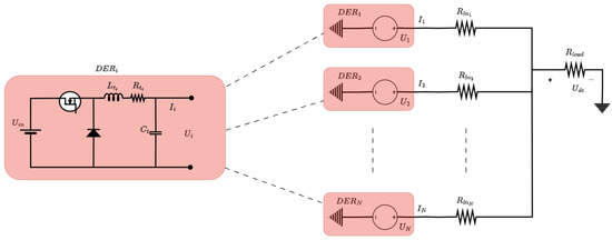 where , , and represent current output, voltage reference, and line resistance for the ith distributed energy source converter, respectively. The reference voltage, established through the utilization of a droop controller to enable current sharing, is presented as: