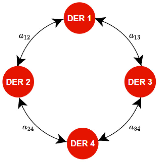 where N represents the number of distributed energy sources operating in the microgrid and denotes the ratio of the current distribution for the ith DER. The adjacency matrix entries, depicted as , are allocated a zero value, signifying a communication link absence or a disconnection, or are configured to one, indicating a connection between the neighbouring DERs.