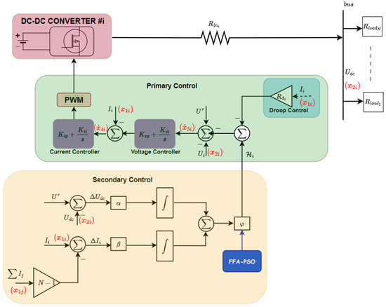 where and denote the current control integral and proportional gains for the ith DER converter, respectively. Utilizing (10) to (13), the SS model for the ith DER, incorporating primary control in the context of a direct current MG application, can be represented in a standard SS format as follows: