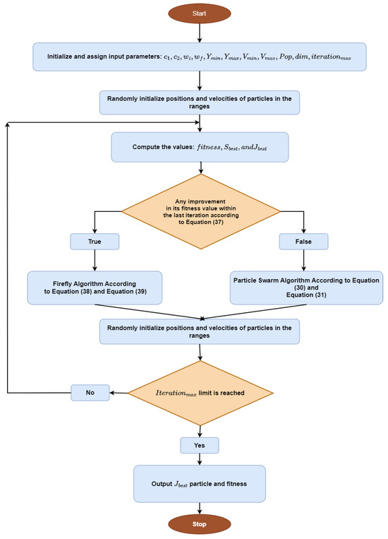 The hybridization of the FFA–PSO techniques was proposed by Aydilek Ibrahim [34]. A hybrid equilibrium is established to balance exploitation (global optima) and exploration (local optima), leveraging the strengths and benefits of both PSO and the FFA methodologies [43]. The firefly algorithm does not incorporate terms for velocity (V) or personal best position (). During a global search, the PSO approach showcases rapid convergence, specifically emphasizing exploration. Furthermore, the FFA proves advantageous in conducting local region searches or excels in achieving precise exploitation. Figure 8 illustrates the flowchart depicting the hybrid FFA–PSO approach.