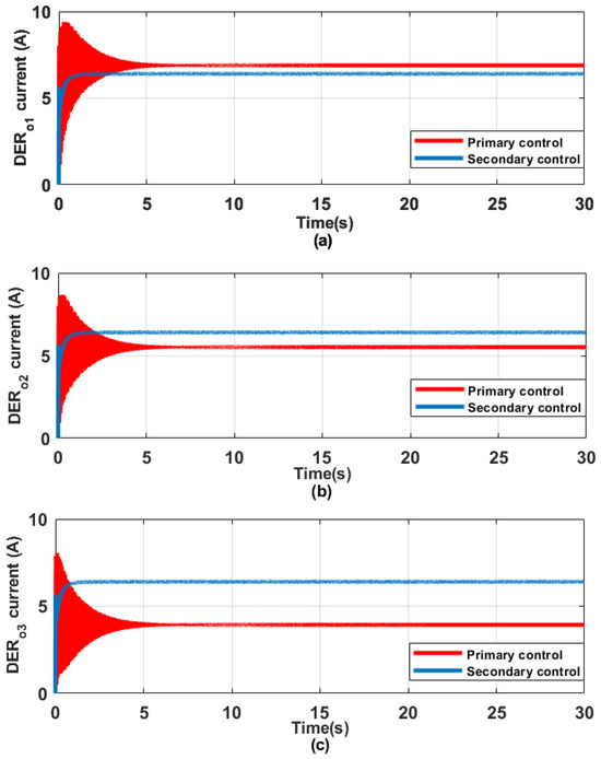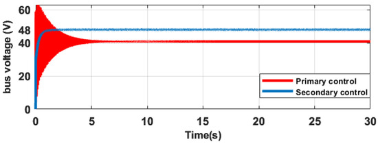 Upon scrutiny of (6), it is apparent that a deviation in the bus voltage () will consistently arise when the current surpasses zero. From Equation (7), it is also evident that increasing the resistance of the droop () significantly to improve accurate current distribution leads to a deviation in DC voltage. Therefore, the primary control alone cannot achieve accurate current distribution among multiple DERs without causing a significant bus voltage deviation. Implementing secondary control becomes crucial to achieve both voltage restoration and precise current sharing simultaneously.