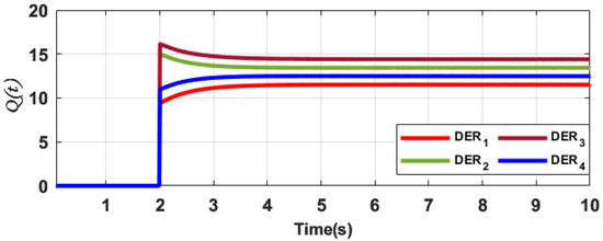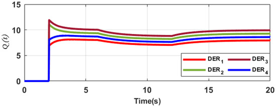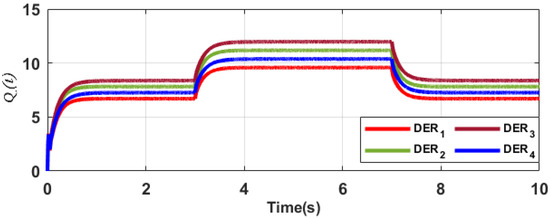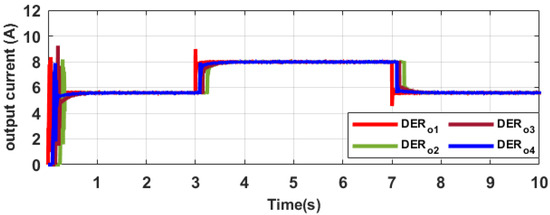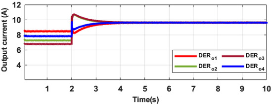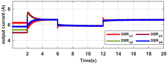 Communication links are pivotal in enabling the functionality of secondary distributed controls within the microgrid. They facilitate interaction and data exchange, which is crucial for achieving the designated control objectives. Consequently, it becomes essential to evaluate how communication network delays may affect the performance of the secondary control introduced in this research. Through the sparse communication topology explained in Section 3.1, different time delays among the DER secondary controllers were investigated. The links , , and are set to 100 ms, 250 ms, and 150 ms, respectively. Three phases were considered in the real-time simulation, spanning a total duration of 10 s. During the first phase, which covers the time span , both the DER primary droop and secondary controllers are initiated at s, coupled with the connection of loads , , and . In the second phase, occurring within the time span , an extra load is integrated at s, and the disconnection of the load occurs at s during the final phase, . The results obtained from the test scenario are presented in Figure 18, Figure 19 and Figure 20. Based on the observation in Figure 18, it is clear that during the first phase, the start times of the output current from the DERs display variability. This disparity emerges as a result of the varying time delays within the microgrid’s communication protocol. Nonetheless, the secondary distributed control introduced in this study guarantees the achievement of consensus in the current distribution within a swift operational timeframe of less than 0.6 s. Likewise, when the load is integrated during the second phase and disconnected during the last phase, the current output of individual DERs adjusts appropriately in both scenarios to match the evolving power requirements. The current output responses mirror the impact of time delay, yet the collective current demand is evenly distributed among the DERs.