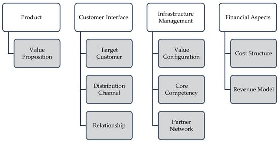 Currently, one of the most popular CBMs available in the literature is a modification of the business model canvas (BMC). Osterwalder et al. (2005) defined BMC as “a conceptual tool that contains a set of elements and their relationships and allows for expressing the business logic of a specific firm”. It includes nine specific blocks in four pillars of business operation [66], as presented in Figure 2. In the first pillar—product—a value proposition shows a general view of an enterprise’s bundle of products or services. In the second pillar—client interface— the target customer presents segments of customers to whom a company wants to offer value; the distribution channel presents different means for the enterprises to get in touch with its customers, while relationship shows the kind of links an enterprise establishes between itself and its different customer segment. In infrastructure management, value configuration contains the arrangement of activities and resources; core competency outlines the competencies necessary to execute the firm’s BM, and partner network presents the network of cooperative agreements with other units necessary to efficiently offer and commercialize value. The last pillar—financial aspects—contains cost structure that sums up the monetary consequences of the means employed in the BM, and the revenue model presents the way a company makes money through a variety of revenue flows [66].