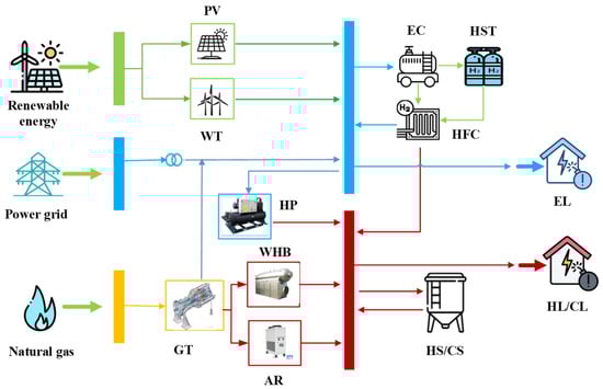 The system incorporates energy storage devices such as hydrogen storage tanks (HST) and combined HS/CS, with their operations governed by the following mathematical models.