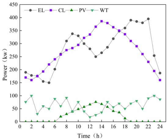 Priority should be given to the use of renewable WT PV in regional cooperation and supply. The gas turbine (GT) can purchase natural gas from the natural gas network for combustion and work, and the high-grade energy released is used for power generation. The high-temperature smoke discharged is reused by the waste heat, cooled by absorption chillers, and utilized by the thermal production capacity of the waste heat boilers. Ground-source heat pumps convert electrical and surface geothermal energy into cold and heat energy. The source side energy in this study is mainly composed of renewable energy, electric energy interactions, and natural gas. It uses the energy source side through a coupling device to meet the load demand of energy conversion; at the same time, the remaining energy is stored in the storage unit of the HST and HS/CS. The energy structure of the entire system is shown in Figure 1.