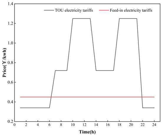 Due to the unpredictable nature of the weather and load data, the analysis focuses on typical winter and summer days to reflect the cyclical energy consumption patterns of a building’s energy systems. The forecasted wind and cooling/heating load profiles are illustrated in Figure 2 and Figure 3, while the ToU electricity pricing for the peak and off-peak periods is shown in Figure 4. The model operates with a time interval Δt of 1 h over a scheduling period T of 24 h.