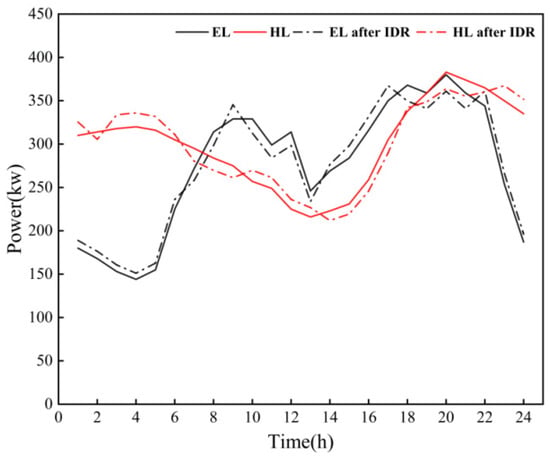 Figure 5 incorporates IDR into the system without changing the total equipment. It encourages users to actively engage in shifting their energy use, moving demand from peak to off-peak hours based on personal preferences and making sensible adjustments during normal periods, as illustrated in Figure 5. For instance, during winter, the electricity load is highest between 10:00–13:00 and 18:00–21:00 when prices are also at their peak. Users can reduce their consumption during these times, which helps to dampen fluctuations in the load and shave peaks, especially during the off-peak hours of 22:00 to 6:00 when electricity is cheaper. Figure 6 shows the changes after IDR in summer. This results in a 5.01% and 5.2% reduction in the peak-to-valley difference in winter, while in summer, the reduction is 5.6% and 4.4%, respectively.