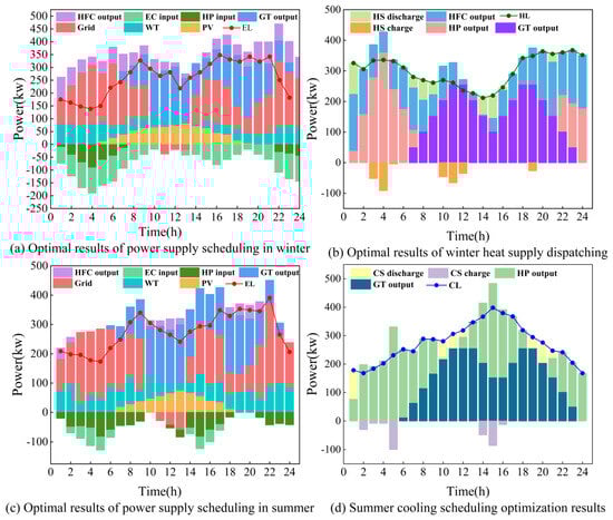 As shown in Figure 7a, the internal power demand of the RIES is lower during the early morning hours (1:00–6:00) and late at night (22:00–24:00), while there is a high demand for heat during winter nights. After evaluating the costs of natural gas and grid electricity, we determined that grid electricity is more cost-effective. According to Figure 8a,b, the ground-source HP and HFC are mainly responsible for meeting the heating demand, while the HST continues to store energy.