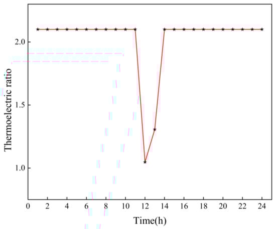 During midday, the demand for heat drops but the demand for electricity rises, resulting in a decreased thermoelectric ratio. In the afternoon, even though EC reaches its highest and the GT is active, its heat output alone cannot satisfy the heating requirements; hence, the HFC continues to operate at an efficient thermoelectric ratio. The adjustable thermoelectric ratio of the HFC allows it to adapt to varying loads, enhancing the system’s energy efficiency and reducing the operating costs of the RIES. The HFC thermoelectric ratio is shown in Figure 9.
