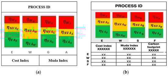 REVAM presents a visualization of resource consumption contributions for each process and highlights the VA, NVA, and W percentages using the “Process Box” format in order to identify areas for improvement within each activity. As shown in Figure 2a, there are three distinct sections.