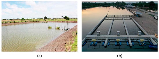 (a) Conventional tilapia production system and (b) In-Pond Raceway System. Source: siamwaterflame.com, https://bangkokbanksme.com/en/passion-manit-group (accessed on 13 July 2022).