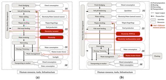 Resource use and tilapia production flow process. (a) Conventional tilapia production; (b) IPRS tilapia production.