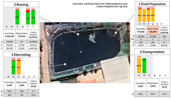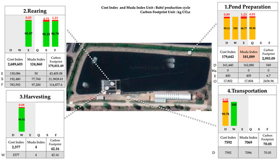 The activities within the four core processes were classified to identify the appropriate resource allocation, as outlined in Table 5. Non-value-added (NVA) and waste (W) activities arise from waiting time, engine start-up, fish mortality, or excessive resource consumption. Due to the limited available data, we made assumptions to derive the diesel and electricity consumption rates and fish survival rates, which are aligned with the recommended benchmarks for resource utilization by the Food and Agriculture Organization (FAO) [42].
