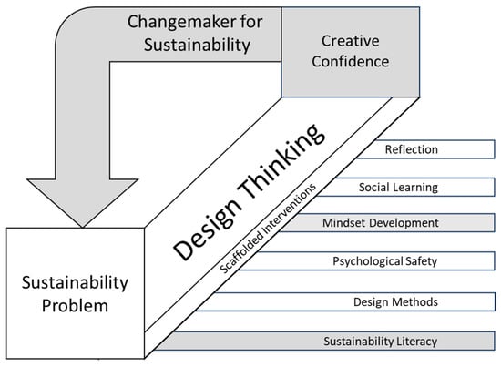 Bryant et al. [] reminds us, “The agency, empowerment and confidence to tackle sustainability challenges is one of the key capacities needed in the world.” Creative confidence is recognised as an outcome of the DT process [,,]. Creative confidence comprises two factors: creative agency, “the ability to apply one’s creativity”, and creative self-efficacy []. Traditional education trains students to “know” before acting []. DT encourages learning from doing through repetition and iteration, which builds confidence through a scaffolded process []. In that process, people’s self-efficacy is increased by having them attempt and accomplish increasingly more complex tasks [,,]. When used repeatedly, DT promotes “creative confidence” or mindsets that support “creative self-efficacy” [,]. Studies show DT increases participants’ confidence [,], which is critical to preparing changemakers to lead sustainability transitions.