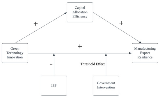 Figure 1 shows the results of this paper, which visually illustrate the interaction between green technology innovation, manufacturing-export resilience, capital allocation efficiency, intellectual-property protection, and government intervention. Green technology innovation promotes the improvement of capital allocation efficiency, which, in turn, promotes the improvement of manufacturing-export resilience, while intellectual-property protection inhibits the improvement of green technology innovation on manufacturing-export resilience, and government intervention exerts a threshold effect on the impact of green technology innovation on manufacturing-export resilience.