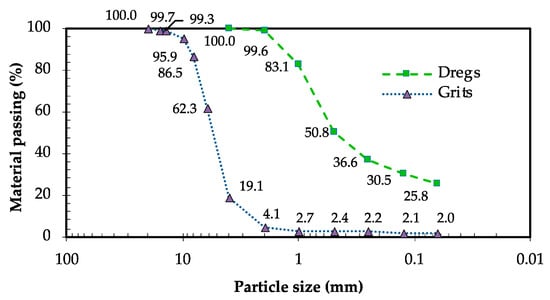 Dregs and grits have a granular form. Figure 2 shows the particle size distribution of those materials applied in the study.