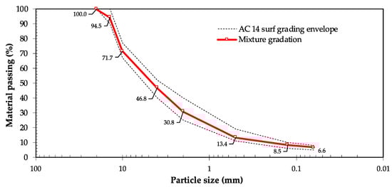 The aggregate blend’s gradation shown in Figure 3 for the reference mixture fulfils the requirements for the grading envelope usually considered in Portugal for a typical asphalt concrete AC 14 surf 35/50 applicable in surface pavement layers.