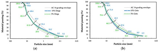 The aggregate gradation and the mastic formed by the fine aggregate particles and the bitumen are determinants of the high air void content. The differences between the blend’s gradations shown in Figure 4 may explain some air void results but do not explain the significant increase in air void content for the mixes with dregs. The typical low sand equivalent of approximately 40% (EN 933-8 []), the high plastic index of 13% (ASTM D4318 []) and the high methylene blue adsorption of 2.2 g/kg (EN 933-9 []) for the fine particles reported by Modolo et al. [] for the dregs are likely to contribute to a weak affinity between these particles and the binder. It must be emphasized that grits exhibited much higher sand equivalent (81%), and the fine particles were declared non-plastic. Therefore, the mastic did not increase the voids at the same level.