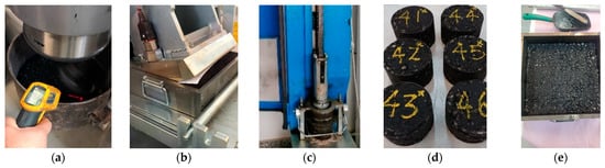Manufacturing procedure and compaction of specimens: (a) mixing; (b) compaction of slabs with the roller compactor; (c) compaction of cylindrical specimens by impact; (d) cylindrical specimens; (e) slabs.