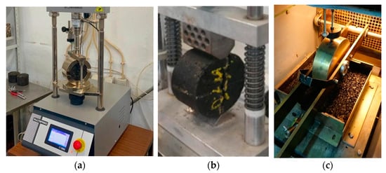 Laboratory tests to evaluate mechanical properties: (a) Marshall test; (b) indirect tensile strength; (c) wheel-tracking test.