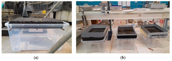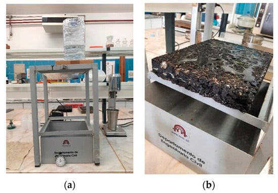 There is no standard for carrying out the water load test and surface runoff test. In fact, these tests were developed to simulate field tests such as lysimeter experiments in a laboratory to assess contamination transport by percolation and surface runoff [,]. It should be noted that, based on the findings of the mechanical tests, these experiments have only been carried out on bituminous mixtures with grits (5% and 10% of the total mass of the aggregates). For each percentage, two slabs were prepared, to which a reference AC 14 surf slab was added. The slabs were trimmed to fit the supporting systems previously prepared to perform the tests. The final dimensions of each slab were 23 cm × 30.5 cm × 4 cm (width × length × thickness). For the water load test, five boxes were drilled to accommodate welded iron mesh, capable of supporting the weight of the slab, preventing its deformations and allow water collection (Figure 7a). Afterwards, the contours of each slab have been waterproofed with paraffin, and a water retaining barrier was mounted around the slabs, as illustrated in Figure 7b. A quantity of 500 mL of distilled water was poured over each slab and was allowed to percolate through the slab. This water was collected from the boxes and sent to an external accredited laboratory to assess the existence of pollutants in it and their concentrations.