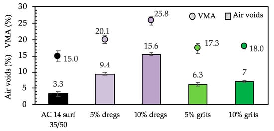 The results for the air voids and VMA of the studied mixtures are shown in Figure 9.
