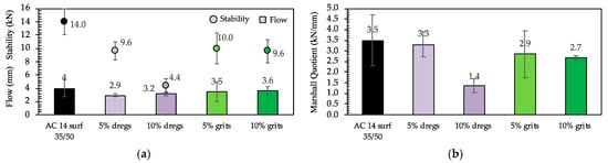 The resistance to external loads of any construction material is a crucial aspect when developing non-traditional sustainable materials. The Marshall compression test is a widespread empirical test that evaluates the stability (strength) of the mixture and the corresponding flow. Moreover, the Marshall quotient (stability/flow ratio) indicates the mixture’s ability to resist traffic loads without excessive deformation. Table 5 summarizes the requirements in Portugal for dense-graded mixtures used in pavement surface layers []. Figure 10 illustrates the observed stability, flow and Marshall quotient results.