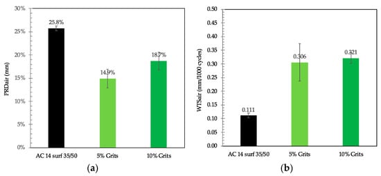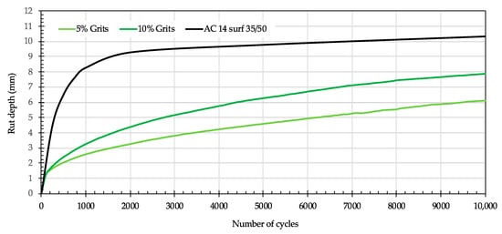 The incorporation of grits influences the response of the bituminous mixture under the repeated load of a wheel at 60 °C. Although the cumulative mixtures’ deformation (Figure 11) was considerably lower for the mixes with grits, this happened because the reference mix suffered about 90% of its deformation over the initial test phase up to the 2000th cycle. Therefore, the PRDair (ratio between rut depth and slab thickness) was considerably higher for the reference mix than those with grits. Nevertheless, the curves in Figure 11 display that WTSair (curve slope) was considerably higher for the mixes with grits for the range of cycles 5000–10,000; approximately three times more. Higher values of WTSair mean that the deformation rate after the initial slab’s densification generally represents asphalt mixtures more prone to suffer rut depth. Usually, the initial rut depth is due to a change in the aggregate skeleton because the mixture’s cohesion is not strong enough to avoid some rotation of the coarse aggregate particles. However, this effect may be reduced if the mastic (a blend of fine particles and bitumen) between the coarser particles is stiffer than usual. Despite that this phenomenon was not assessed in this study, the grits are likely to stiffen the mastic and, thus, contribute to a lower rut depth in the first part of the wheel-tracking test, even though the blends with grits had higher air void content.