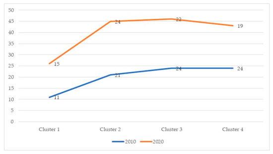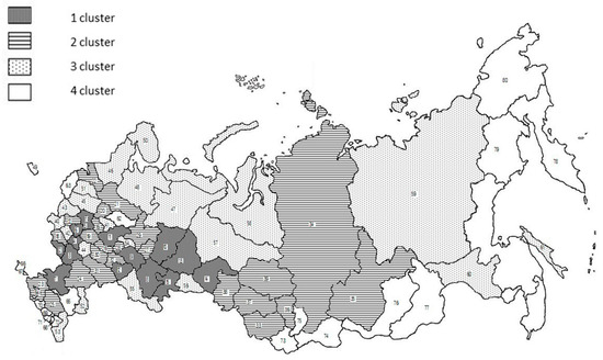 The set of indicators was selected by the author as a result of the literature review and data availability. Thus, in order to analyze the differences between Russian regions in terms of the level of innovative development, a set of indicators related to human capital, financing of R&D activities, enterprises’ activities in the field of innovation, intellectual property protection, regional wealth and labor activity, as well as the economic efficiency of enterprises, was adopted. The selection of indicators was also aimed at providing an opportunity to assess the diversity of the regions’ level of innovation and to identify which of them have problems with the development of innovation and which of them achieve very good results in this process. The indicators adopted for analysis and covering data for the period from 2010 to 2020 are also diagnostic variables. The study uses a dynamic approach, which allows us to make comparisons between the values of variables for different periods not only in relation to other objects of study (i.e., regions of Russia) but also in relation to time. The set of 16 indicators presented in Table 1 formed the basis for further analysis, on the basis of which differences in innovative development of individual regions were assessed and their clustering was carried out.