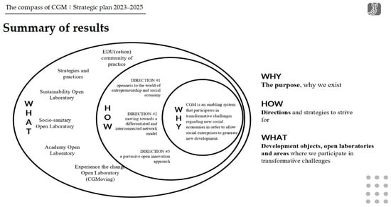 All these transformations have required CGM to reconfigure itself as a meso-institution through a new way of strategising. The new strategic plan appears to be in discontinuity with regard to the methodological and mindset aspect, trying to interpret the needs of its network and to amplify its impact in a rapidly changing context. The plan is, therefore, a compass built on principles and directions to drive its system to evolve, to “stay into challenges” and to anticipate repeated crises through a new approach to design an organisational and strategic management []. The result of this new approach is summarised in the next Figure 1 and consists of the definition of a “statement of purpose” about the role of CGM in the near future, the identification of some “drivers” that follow, in a proactive way, the grand challenges and a series of “open laboratories” to experiment with this new strategic posture of the consortium.