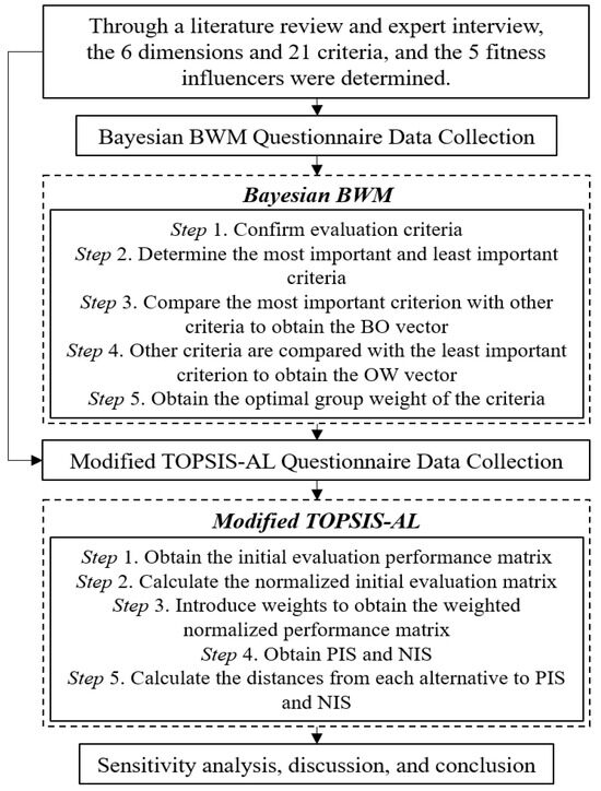 The proposed model has two evaluation stages. First, the Bayesian BWM is used to calculate and prioritize the best weights of the dimensions and criteria based on the proposed dimensions and criteria in Section 2. Bayesian BWM was chosen because it is a novel technique for group decision analysis, and the final weights obtained through the Bayesian iterative computations are better than the average weights of traditional BWM, thus overcoming the disadvantage of using traditional arithmetic means that combine expert opinion with statistical estimation methods. A criterion with a higher weight indicates that it is relatively more important in the evaluation system. Subsequently, the Modified TOPSISAL technique is used to calculate the performance values and ranking results of the alternative (fitness influencers) and to propose strategies to improve the fitness influencer competencies based on the evaluation results.
