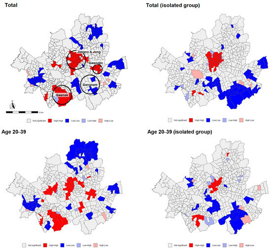 SPHs with a high risk of social isolation seem to have a similar distribution pattern to that of SPHs of the same age; however, differences in the concentration by age group exist. For young adults, isolated SPHs were relatively dispersed compared to SPHs of the same age, whereas middle-aged people were only concentrated in Jongno compared to their counterparts. However, older adults were more concentrated in Jongno and Gwanak.