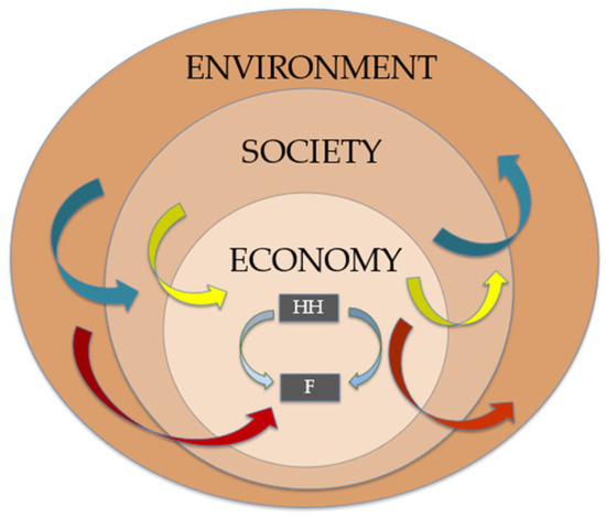 Neoclassical economic theory, the prevailing economic framework in the US, supports these persistent gender biases. It asserts that firms (“producers”) and households (“consumers”) engage with each other in a closed-loop circular flow. Households provide inputs (mostly labor) and money to the firms, who, in exchange, provide goods and wages to the households [21] (see Figure 1). While helpful in characterizing some rudimentary aspects of a market economy, this theory fails to account for several critical components, such as the environment and other aspects with limited or no market value [21,22].