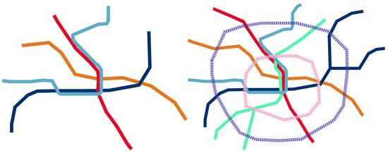 Like most US public transportation systems, WMATA (also referred to as Metro) professes to utilize a gender-blind approach to optimize work-related travel, characterized by lengthy, linear, unaccompanied, rush-hour trips. As Sanchez de Madariaga [70] and Loukaitou-Sideris [69] have argued, men, not women, typically follow those patterns. This gender-biased approach results in a transportation system that seeks to minimize the time in transit from the home to the workplace in a spider-type fashion, with the most significant workplace locations located at the hub. This design trope is evident on the Metro system map, where all the rail lines radiate from the center out to the periphery without any circular routes (Figure 3) [74].