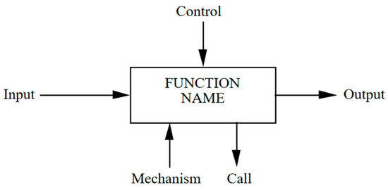 IDEF0 model Schema [32]. Control arrows indicate the constraints or directions for the function or process, such as plans, standards, or specifications. Inputs and outputs are the entities created from or used in the function or process, such as information, data, and items. A call arrow leads to more information about the function. Lastly, mechanisms are elements needed for the process or function to operate, such as equipment or people.