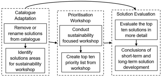 The approach used in this paper is outlined in Figure 3 and follows three main activities, namely Catalogue Adaptation, Prioritisation Workshop, and Solution Evaluation. Catalogue Adaptation drew on and adapted previous research. Workshop steps were designed to facilitate communication and data gathering from companies, while the Solution Evaluation step involved an in-depth analysis of the specific existing solutions. Each activity follows from the previous one and contains two key stages. This section explains each of these activities in more detail.
