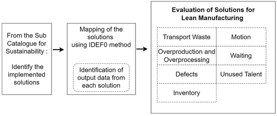 The top ten solution areas identified in the workshop were evaluated in further detail. First, implemented solutions from the solution areas were identified, and the IDEF0 diagram of each solution was mapped to examine the data output generated by each of these digital solutions. This analysis aimed to ascertain the specific types of data and insights provided by each solution. The second step involved establishing a clear connection between these digital solutions and the eight wastes of lean according to the insights provided by each solution. The objective here was to determine how each digital solution could be utilised to identify and address specific waste elements within the operational processes and compare it with the workshop results. In this step, all eight wastes of lean were considered. Overprocessing and overproduction were combined because these categories were similar and resulted in identical evaluation results. The evaluation process diagram is shown in Figure 6.