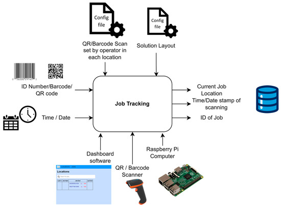 An evaluation of the top ten priority solutions was then performed to explore how existing low-cost digital solutions could be used for sustainability. As previously mentioned in Section 3.3, the solutions were mapped against the eight wastes of lean that they could impact. This mapping builds and expands on this work displayed in Table 1. An example of the IDEF0 diagram created for each solution for the Job Tracking solution can be seen in Figure 8. This diagram was drawn up for all the solutions and allowed the authors to identify the output data of each solution and accordingly evaluate the use of the solution in monitoring or managing the various wastes. The remaining diagrams for all solutions can be seen in Appendix A.