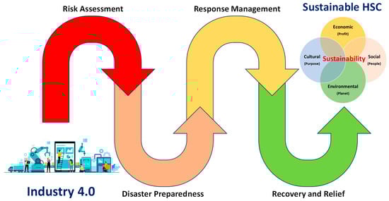 Recently, the United Nations outlined the sustainable development goals (SDGs) as a global objective to foster prosperity for people and the planet through collaborative efforts among nations. In this context, SHSCs can contribute to meeting several SDGs, including SDG#2 (Zero Hunger), SDG#3 (Good Health and Wellbeing), SDG#11 (Sustainable Cities and Communities), and Climate Action (SDG#13). We adopt a disaster management stream in SHSCs, divided into risk assessment, preparedness, immediate response, and ongoing recovery and relief, as illustrated in Figure 2 (see [47]). We assert that I4.0 technologies can enhance performance for all these phases of HSC.