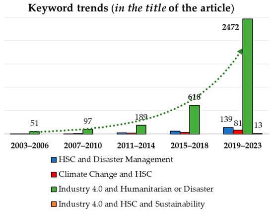 In Figure 3, which considers the search terms ”anywhere in the article”, a clear upward trend is observed in research on I4.0, HSCs, disaster, and climate change. Notably, there is an increasing focus on climate change within the HSC field and the application of I4.0 in HSCs within the context of disasters. For instance, from 2019 to 2023, approximately 60,000 scholarly works included the term ”I4.0”, encompassing technologies such as AI and BkCn, in conjunction with terms ”humanitarian” and ”disaster”. A closer analysis revealed that about 7700 articles specifically mentioned ”COVID” (4470 in 2022, 2560 in 2021, and 675 in 2020), underscoring the substantial impact of the COVID-19 pandemic and the active consideration of I4.0 technologies.