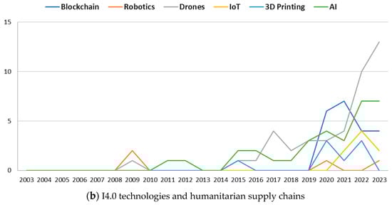 Publication trends on I4.0 technologies in (a) SCs and (b) HSCs (2003–2023).