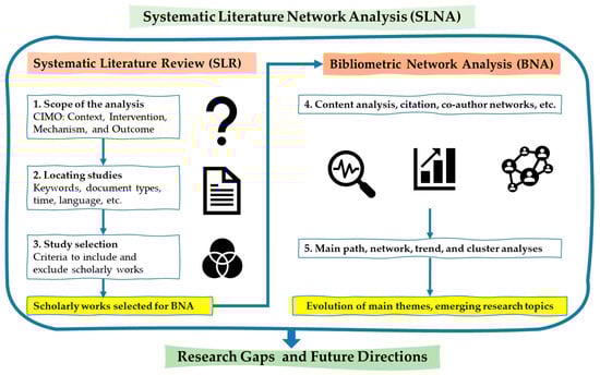 This study employs systematic literature network analysis (SLNA), integrating an organized literature review with bibliometric network analyses [13,59,60]. Figure 6 illustrates the SLNA process utilizing multidisciplinary academic databases.