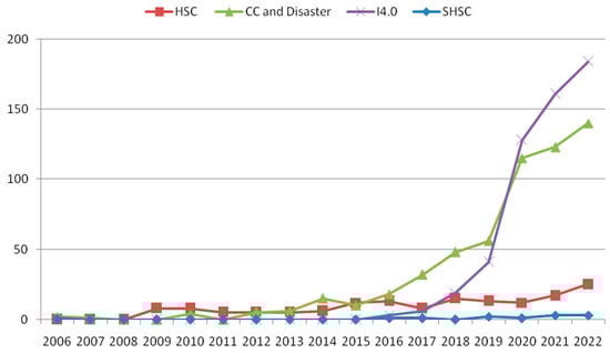 The number of articles related to HSCs, CC and disasters, I4.0, and SHSCs within targeted journals (2003–2022).