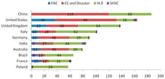 Figure 8 illustrates the leading contributors regarding the total number of articles. China emerges at the forefront with the highest total number of papers (186), followed closely by the United States (164) and the United Kingdom (138). In the realm of HSCs, the United States takes the lead with the highest number of articles, followed by the United Kingdom and France. For climate change and disaster, China leads the pack with the most publications on this subject (119), followed by the United States and the United Kingdom. China stands out again in the domain of I4.0 technologies, boasting the highest number of articles related to this area (66), followed by the United Kingdom and Italy. Lastly, in terms of the SHSC field, India takes the lead, followed by the United States.