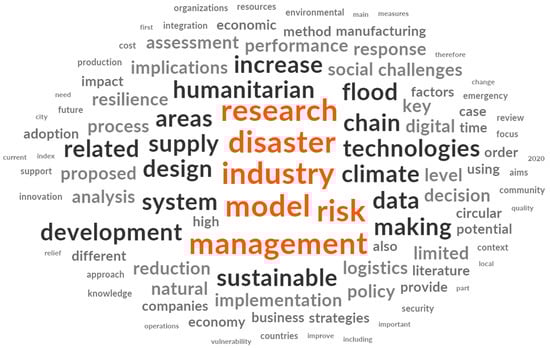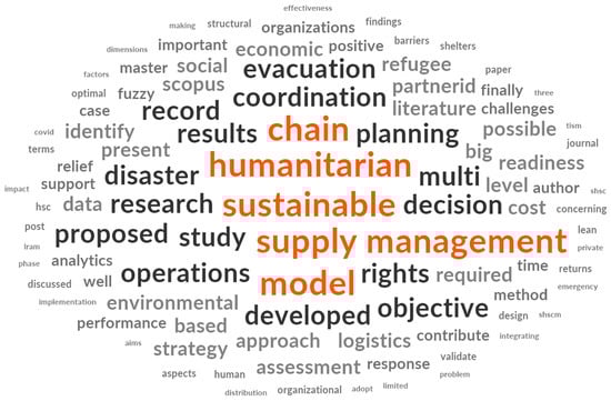 Subsequently, critical keywords, in black and medium-sized fonts, include humanitarian, supply, chain, technology, climate, sustainable, development, system, design, related, flood, data, increase, areas, and making. Furthermore, smaller black words, such as social challenges, decision, limited, logistic, implementation, reduction, process, resilience, implications, performance, response, digital, key, level, policy, natural, reduction, analysis, proposed, and assessment, complement the central themes. The multifaceted nature of these keywords underscores the intricate and consequential landscape of this field of study. Researchers have probed various dimensions to drive innovation and address the complexity of HSCs.