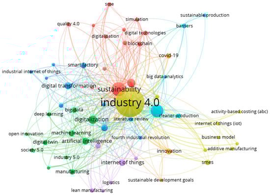 On the other hand, Figure 4 offers a more focused perspective, considering scholarly works where the search terms were explicitly present in the articles’ titles and abstracts. During the 2019–2023 period, when these terms first emerged, a few works included the terms “I4.0”, “HSC”, and “Sustainability” or “sustainable” [28,53,54,55,56,57].